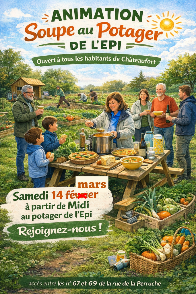 L’Epi castelfortain convie le samedi 14 février à partir de midi tous les habitants de Châteaufort qui le souhaitent à venir partager un moment convivial au « Potager de l’Epi » autour d’un apéritif/soupe.