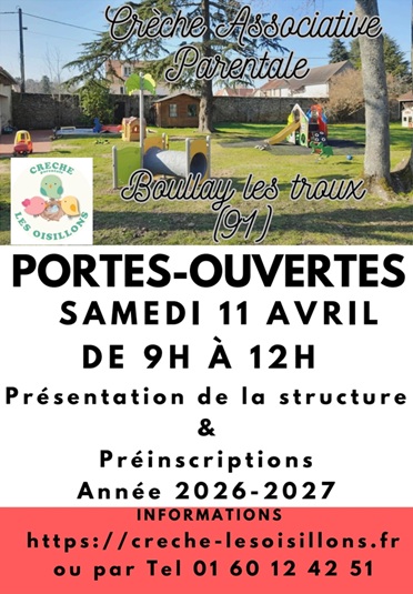 La commune de Châteaufort a signé depuis de nombreuses années une convention avec la crèche de Boullay-les-Troux, Les Oisillons, pour un accueil occasionnel de type « halte-garderie ». Cet établissement propose une matinée « portes ouvertes » lors de laquelle des pré-inscriptions pour la rentrée de septembre pourront être prises :